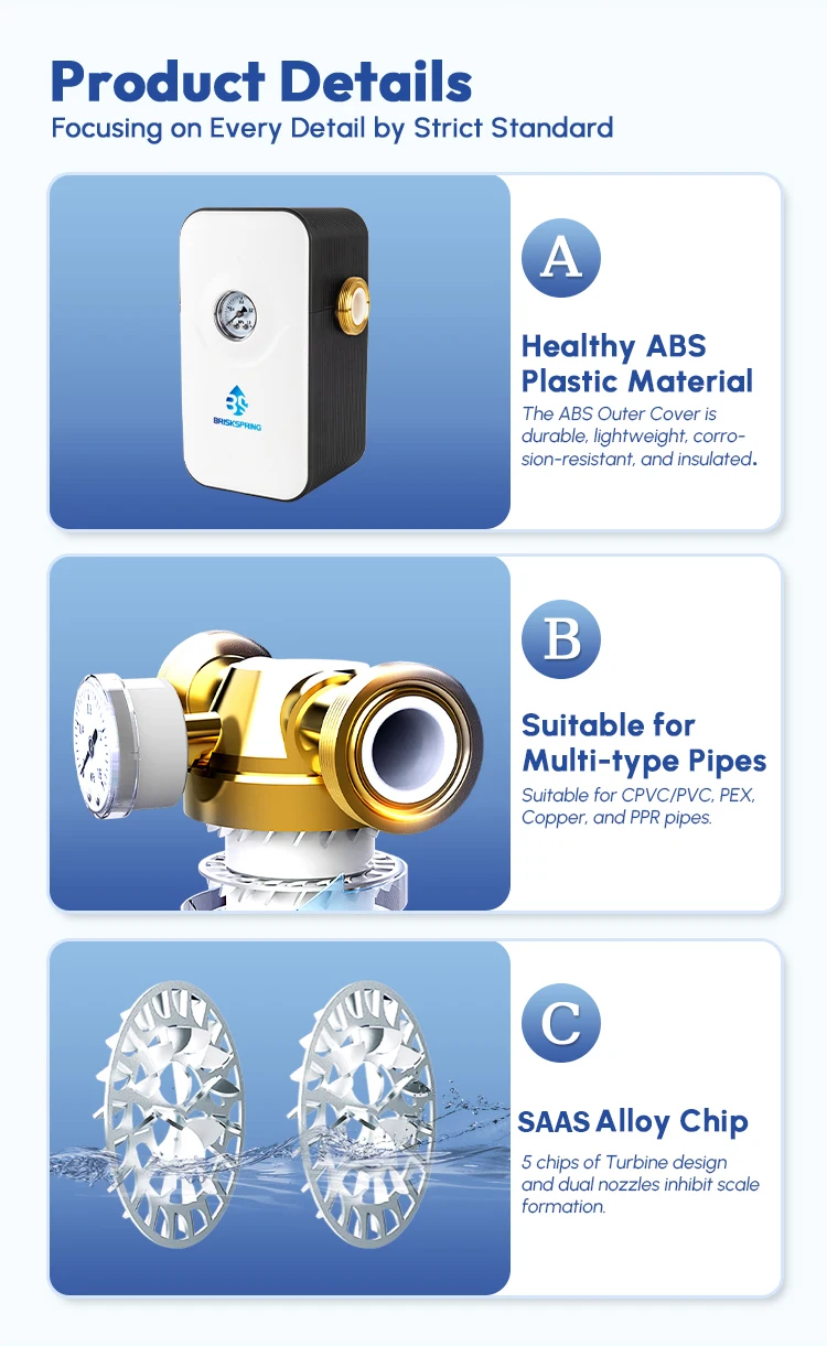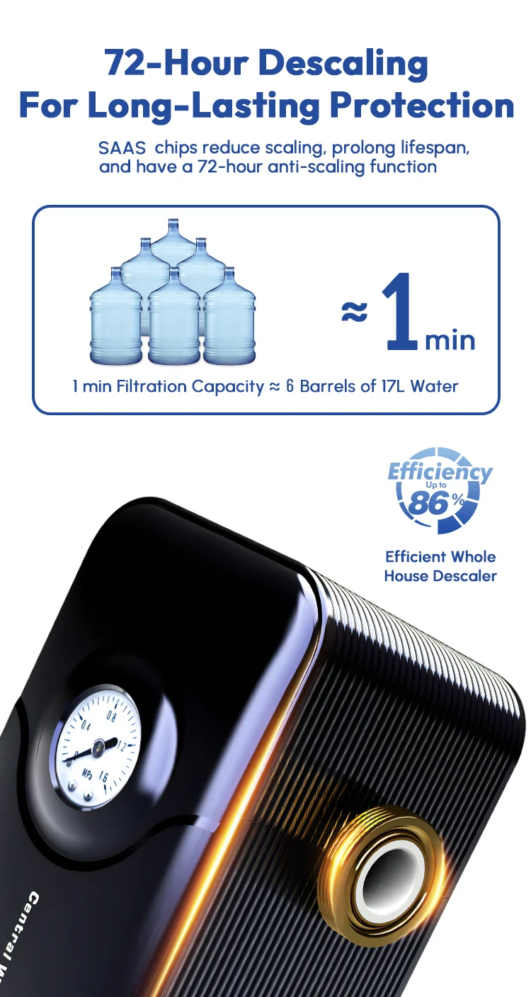 Suitable for Whole house scale inhibition. Significantly reduce scaling and blockage in terminal water appliances such as water heaters, smart toilets, washing machines, and shower heads etc ,ectively extending equipment lifespan and reducing energy consumption.