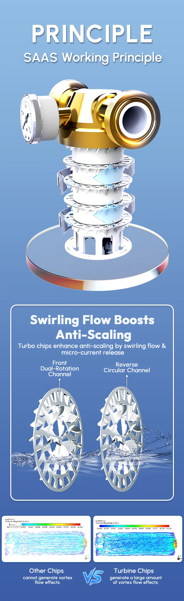 A special alloy anti-scaling material independently developed.When the fluid(water)is in full contact with the material, a solid-liquid-electronic interaction occurs, which changes the physical properties of the fluid, affects the nucleation and crystallization process of scale crystals, and changes the shape of scale crystals. The scale is easy to disperse and difficult to adhere, achieving excellent anti-scaling performance .